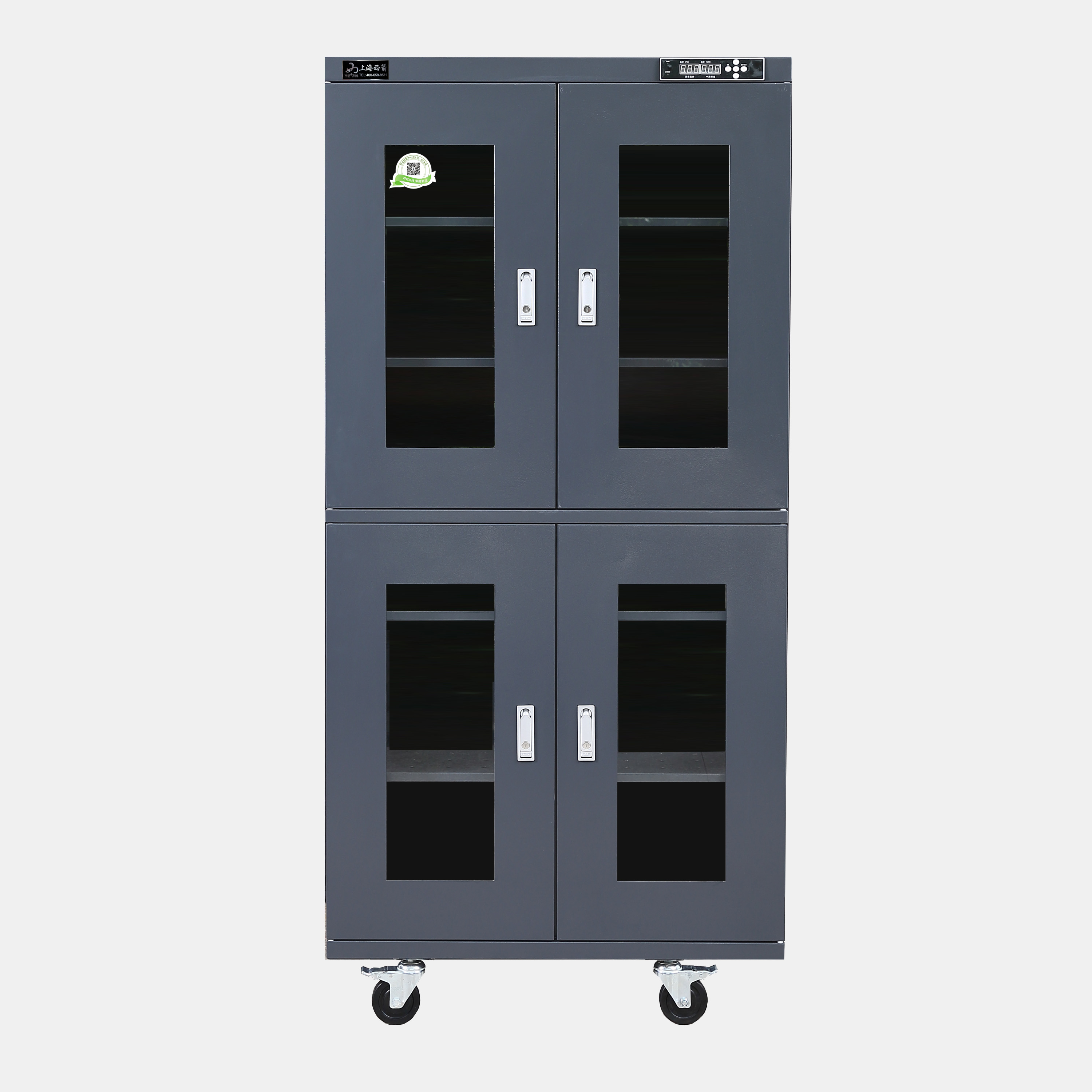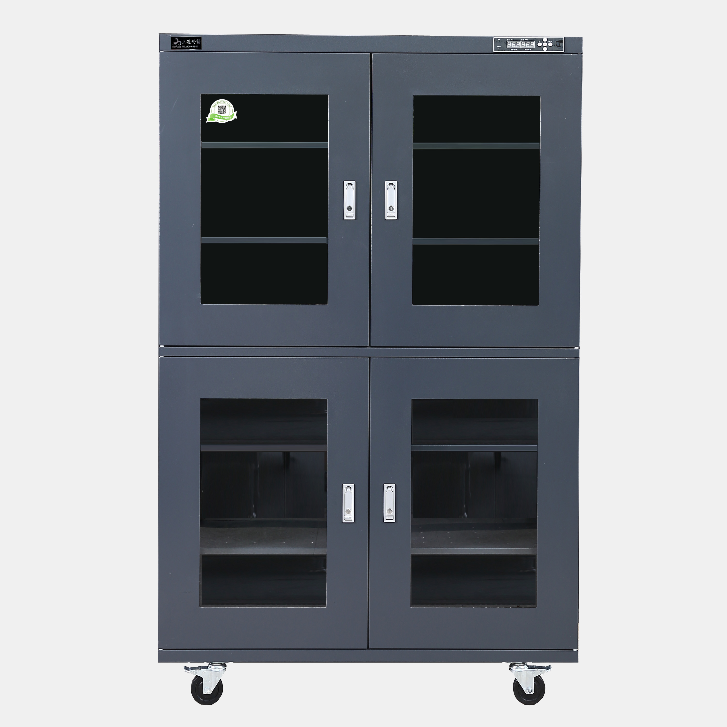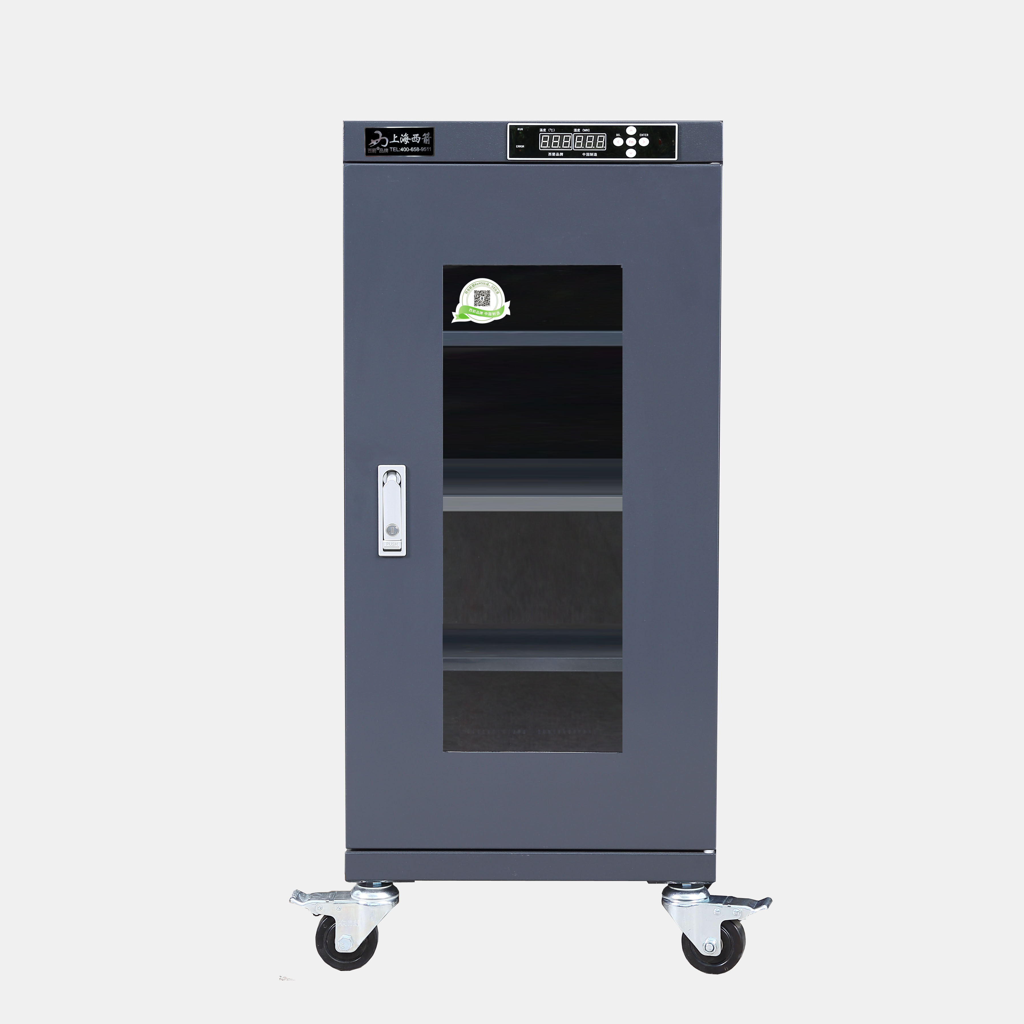 3.防潮箱門玻璃區域選用3.0mm鋼化玻璃,防前傾耳式結構設計。帶平面加壓把手鎖*體化設計,有防盜功能。**部安裝可移動帶剎車腳輪方便移動及固定(防靜電機型腳輪為防靜電)。