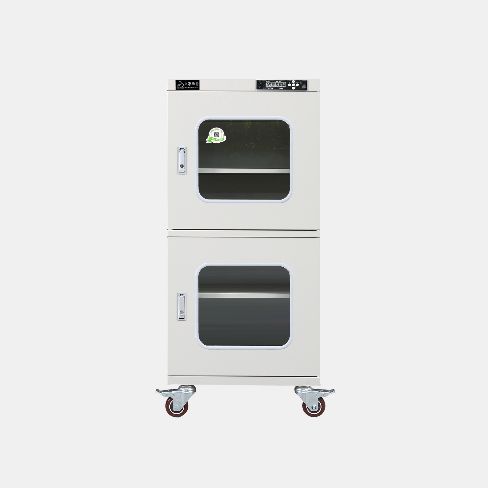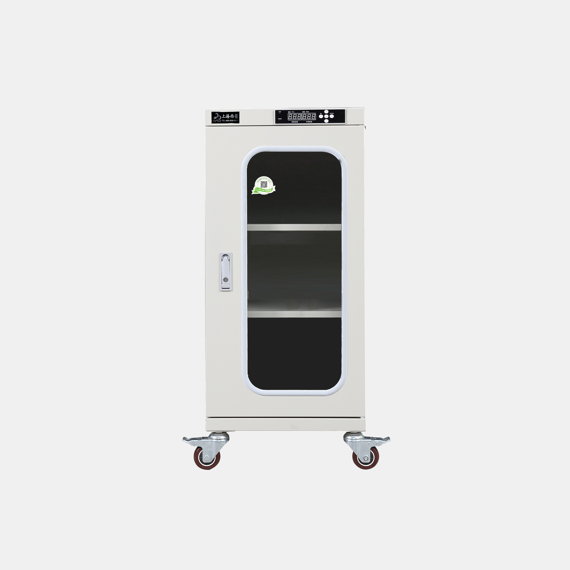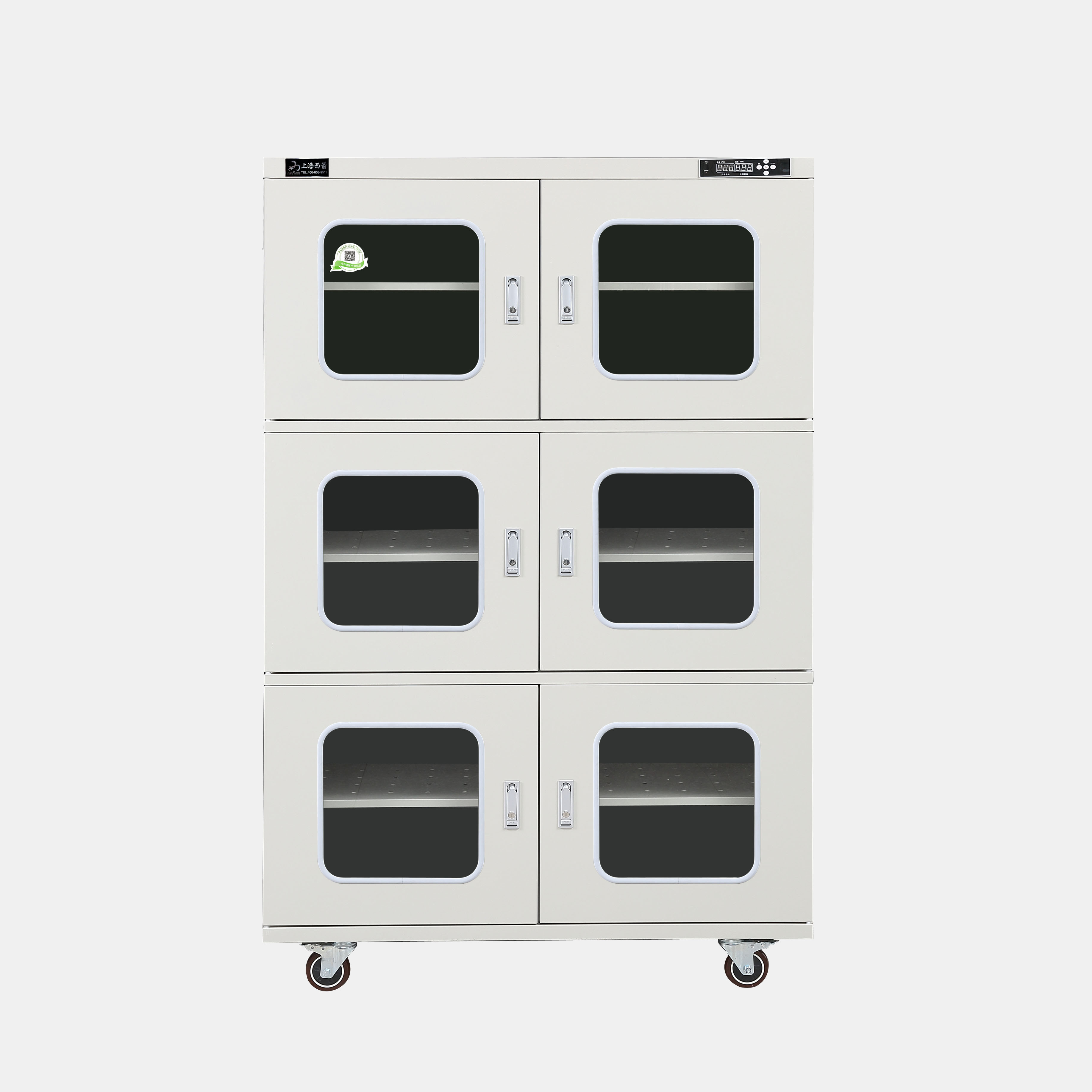 3.防潮箱門(mén)玻璃區(qū)域選用3.0mm鋼化玻璃,防前傾耳式結(jié)構(gòu)設(shè)計(jì)。帶平面加壓把手鎖*體化設(shè)計(jì),有防盜功能。**部安裝可移動(dòng)帶剎車(chē)腳輪方便移動(dòng)及固定(防靜電機(jī)型腳輪為防靜電)。