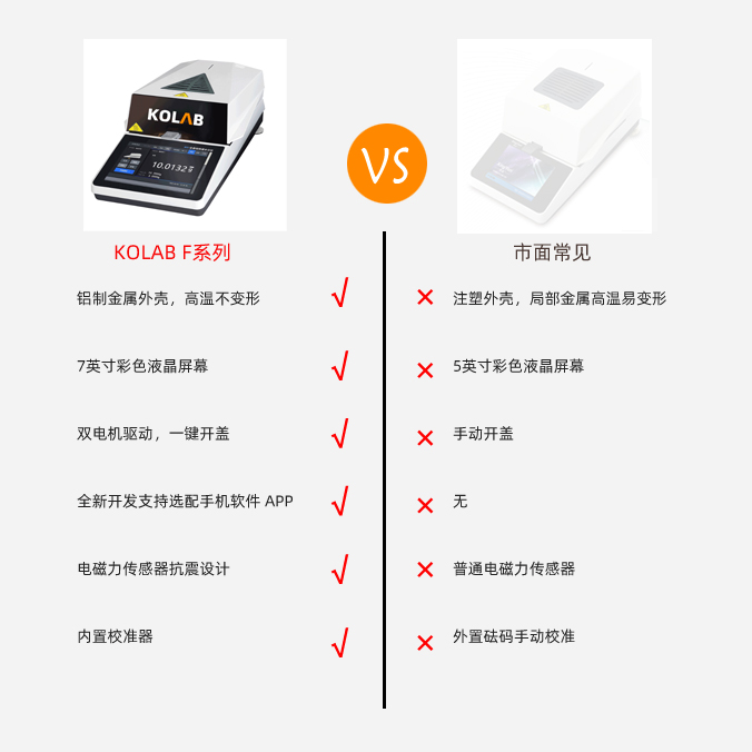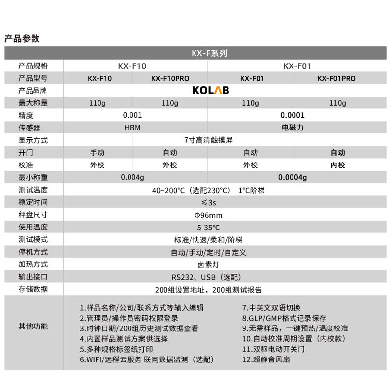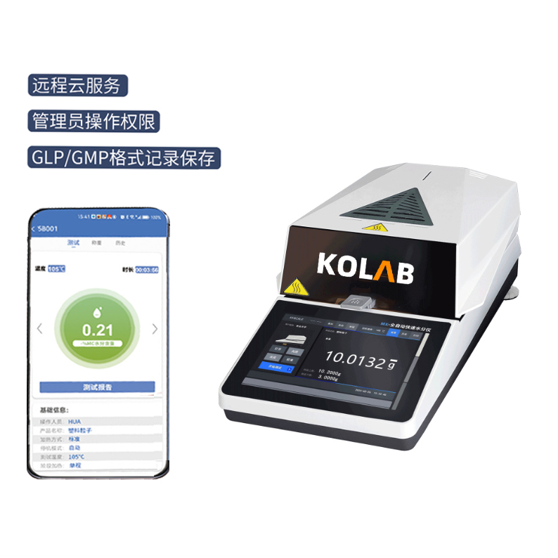 KX-F系列智能水分測定儀集成了KOLAB 科西水分測定成熟技術,使整個分析系統(tǒng)更加**善。采用高效率的烘干加熱器-高品質(zhì)環(huán)狀鹵素燈進行加熱,對樣品進行快速、均勻的加熱;儀器設計智能化、簡單化,實現(xiàn)了用戶*鍵式測量功能,*需**業(yè)知識。因*同行業(yè)對水分有著*同的定義,為滿足用戶的需求,KX-F系列內(nèi)置多種水分顯示方式,包括但*限于含水率、固含量、回潮率、木材含水率等多種模式,并針對*同行業(yè)的*同樣品,儀器預留了多種用戶自定義測定方法,用戶可根據(jù)實際需求設置測量模式,自定義程序自動儲存,調(diào)取方便、快速,滿足行業(yè)多種樣品的測定需求。該系列水分測定儀全金屬機身、支持高溫檢測,升溫快、加熱均勻、使用簡單、壽命長等特點。