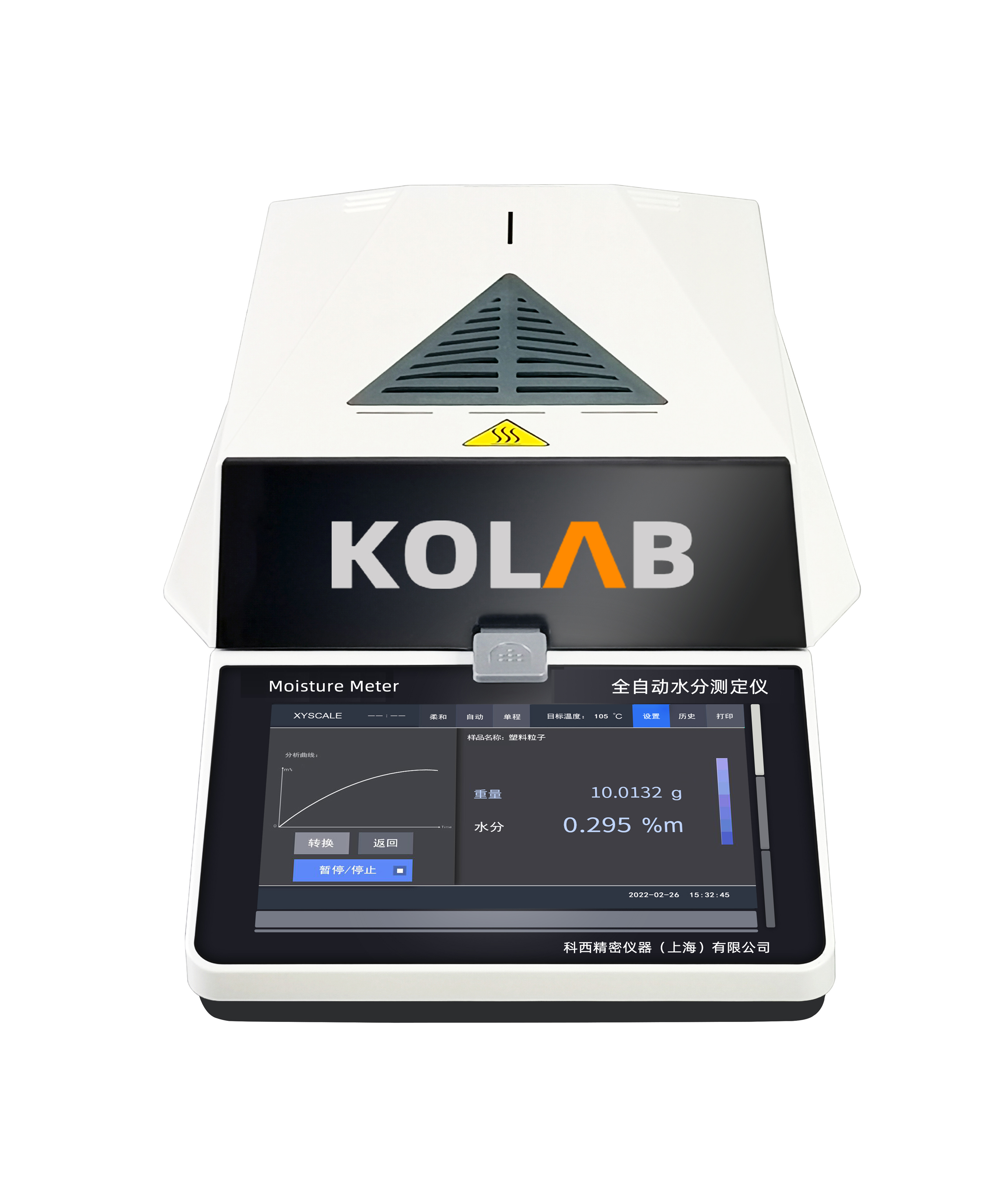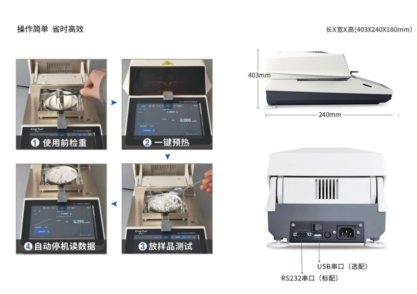 操作簡單,W需安裝、調(diào)試、培訓,拆箱即可使用;7寸彩色觸摸電容屏設計,實時顯示樣品狀態(tài),— 鍵式電動開蓋,樣品放入— 鍵啟動,自動停機并顯示水分含量。